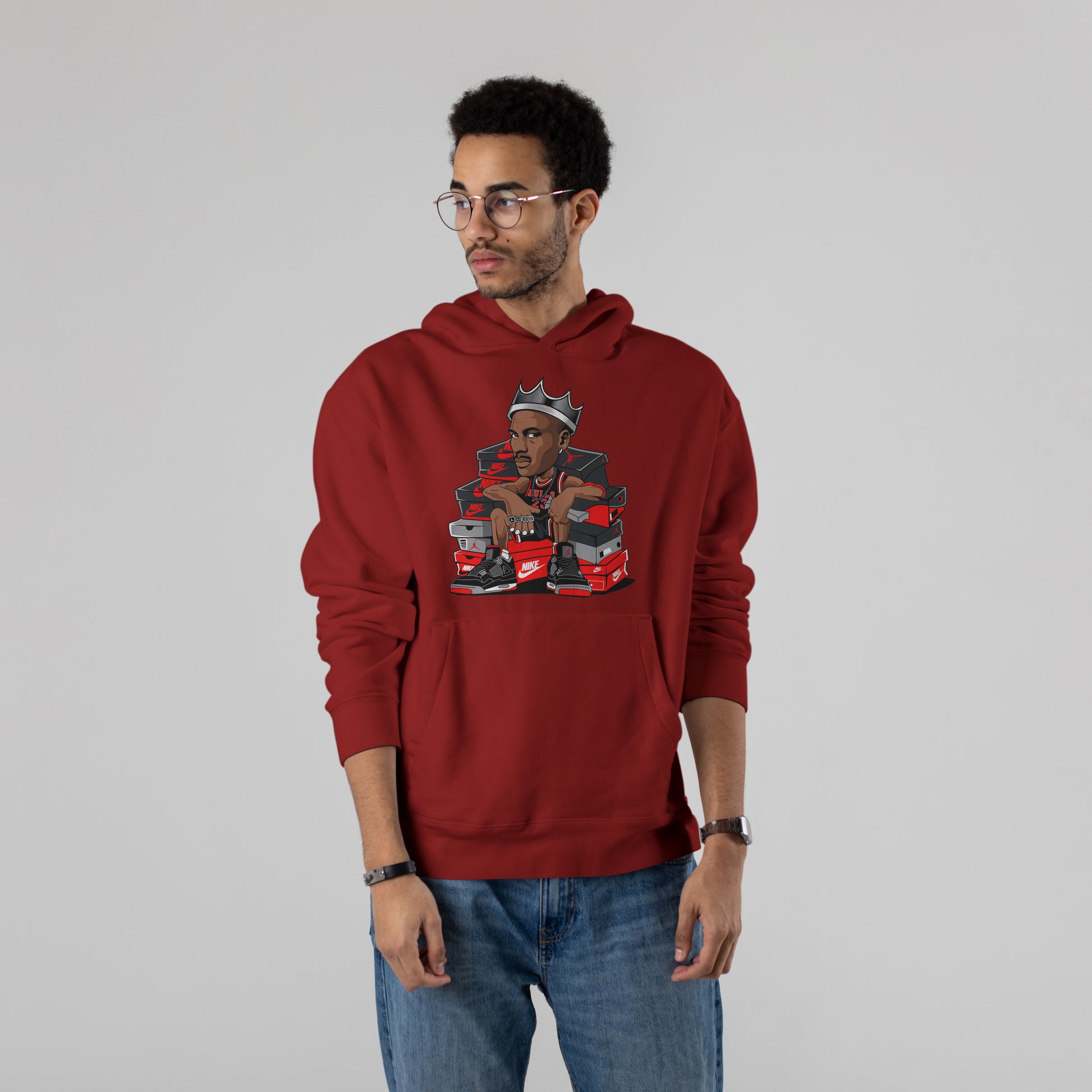 This NBA-inspired Michael Jordan front-art hoodie is pure royalty with street swagger. Crown on head, kicks stacked high, and confidence louder than a sold-out arena - this design screams dominance, legacy, and βsix rings energyβ without saying a word.