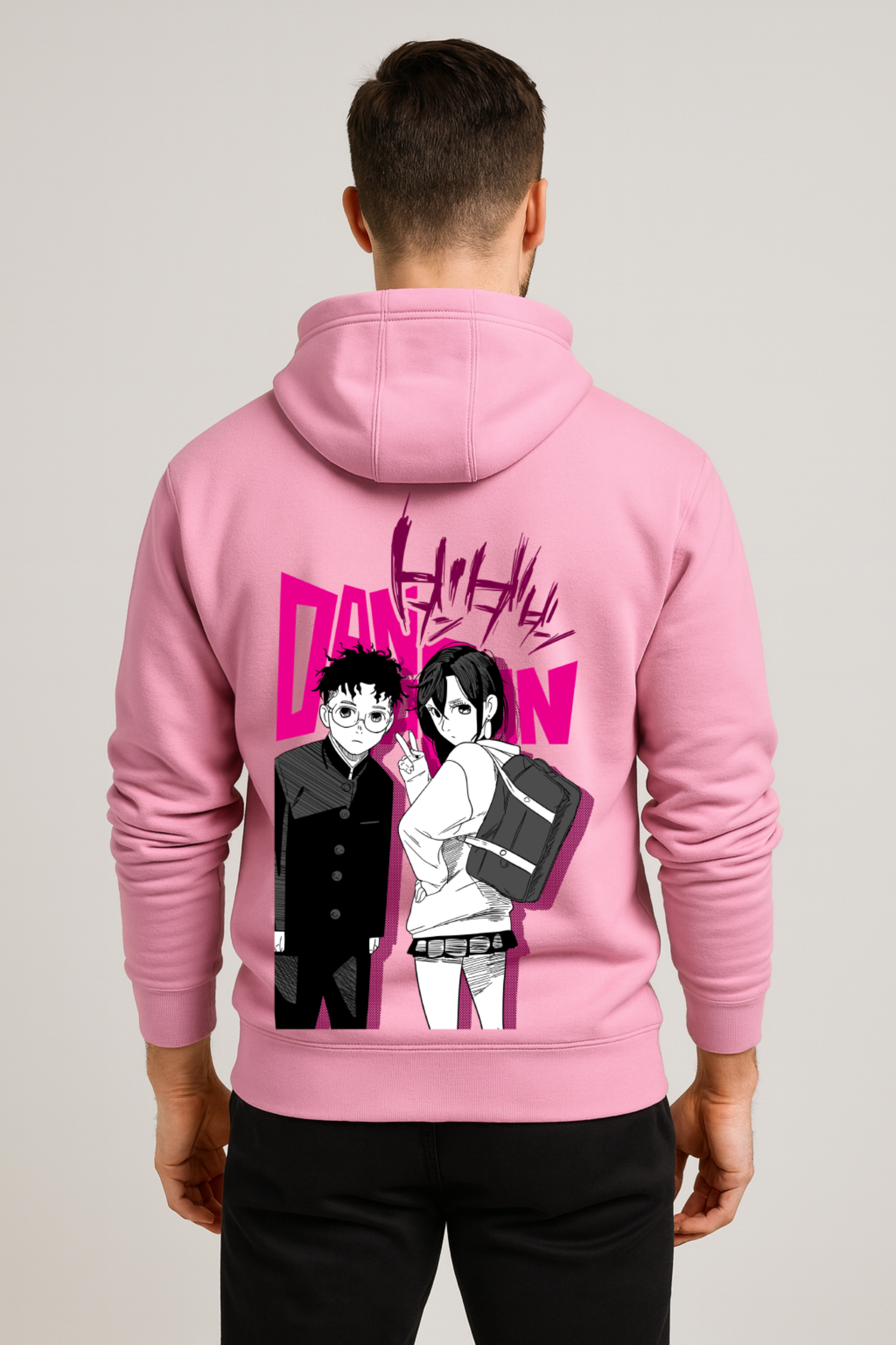 The back design features both characters in classic manga shading: Okarun rocking his awkward-cool uniform vibe, and Momo throwing the ultimate peace-sign attitude like she owns every dimension she walks into. Behind them, the bold hot-pink DAN DA DAN lettering screams energy, giving the whole artwork a magazine-cover-level impact.