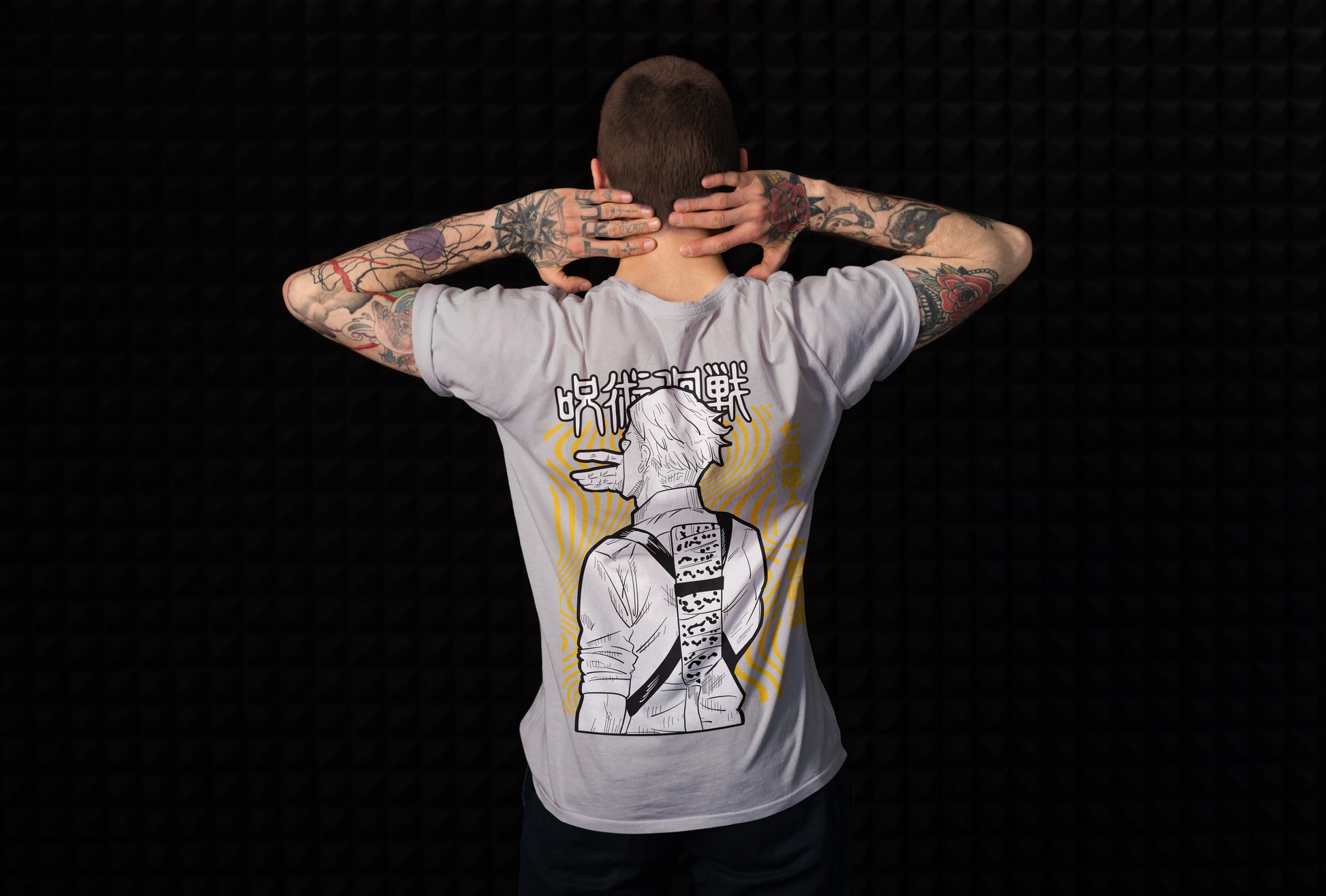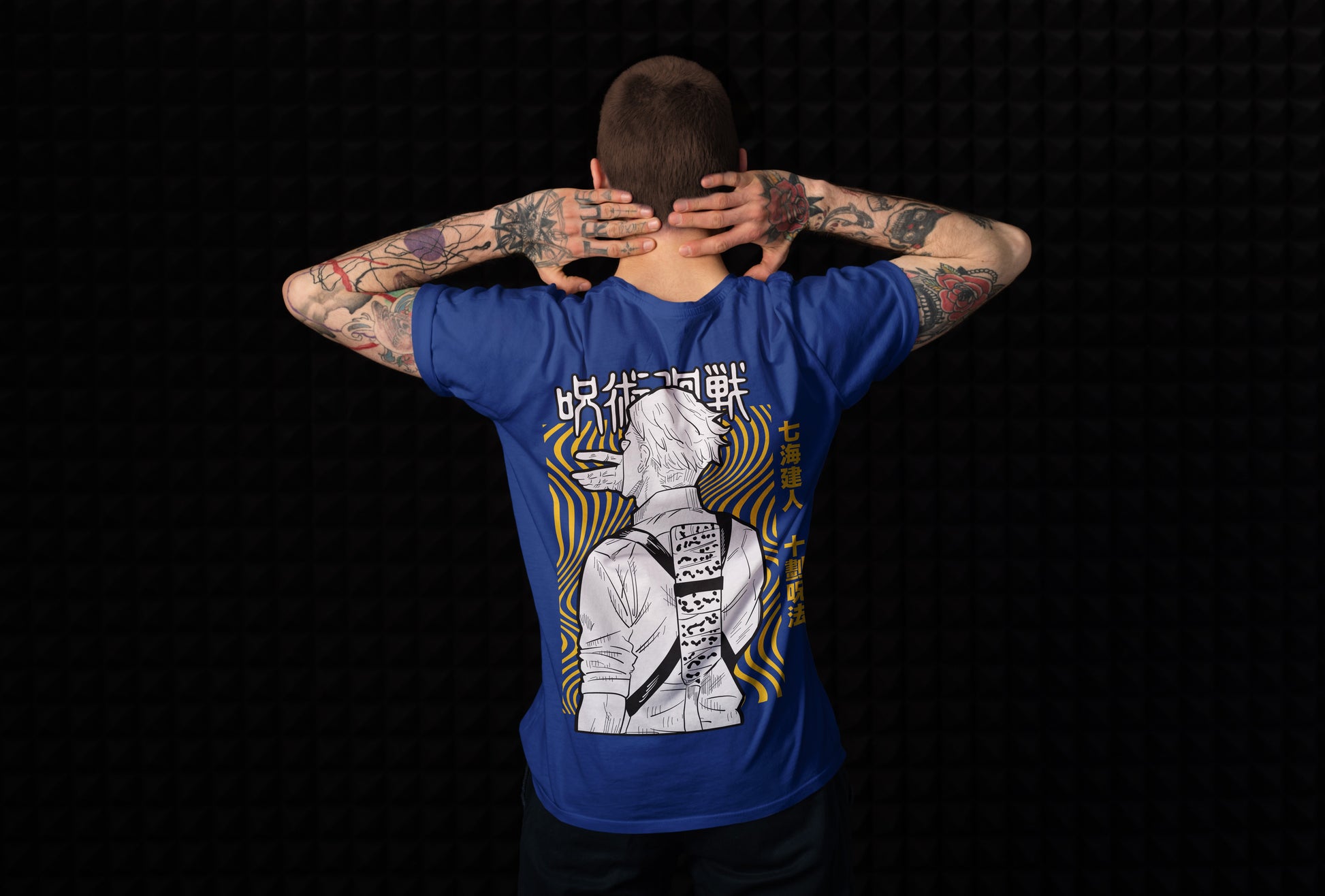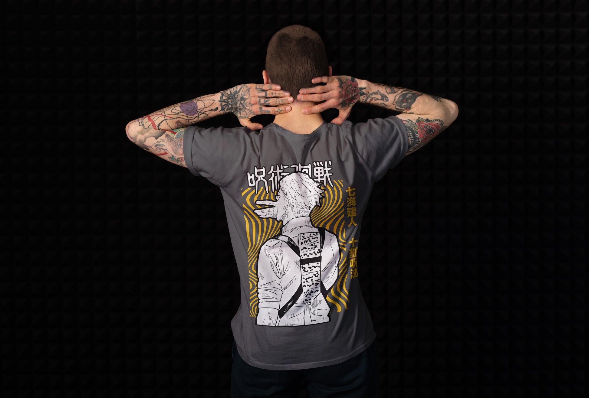 The front features Nanami’s signature stoic stare, tie tight and vibe tighter. Flip it around and get the full action-mode flex — tie loosened, sleeves rolled, cursed technique ON. All printed on premium breathable cotton for serious comfort while you fight curses or just survive meetings.