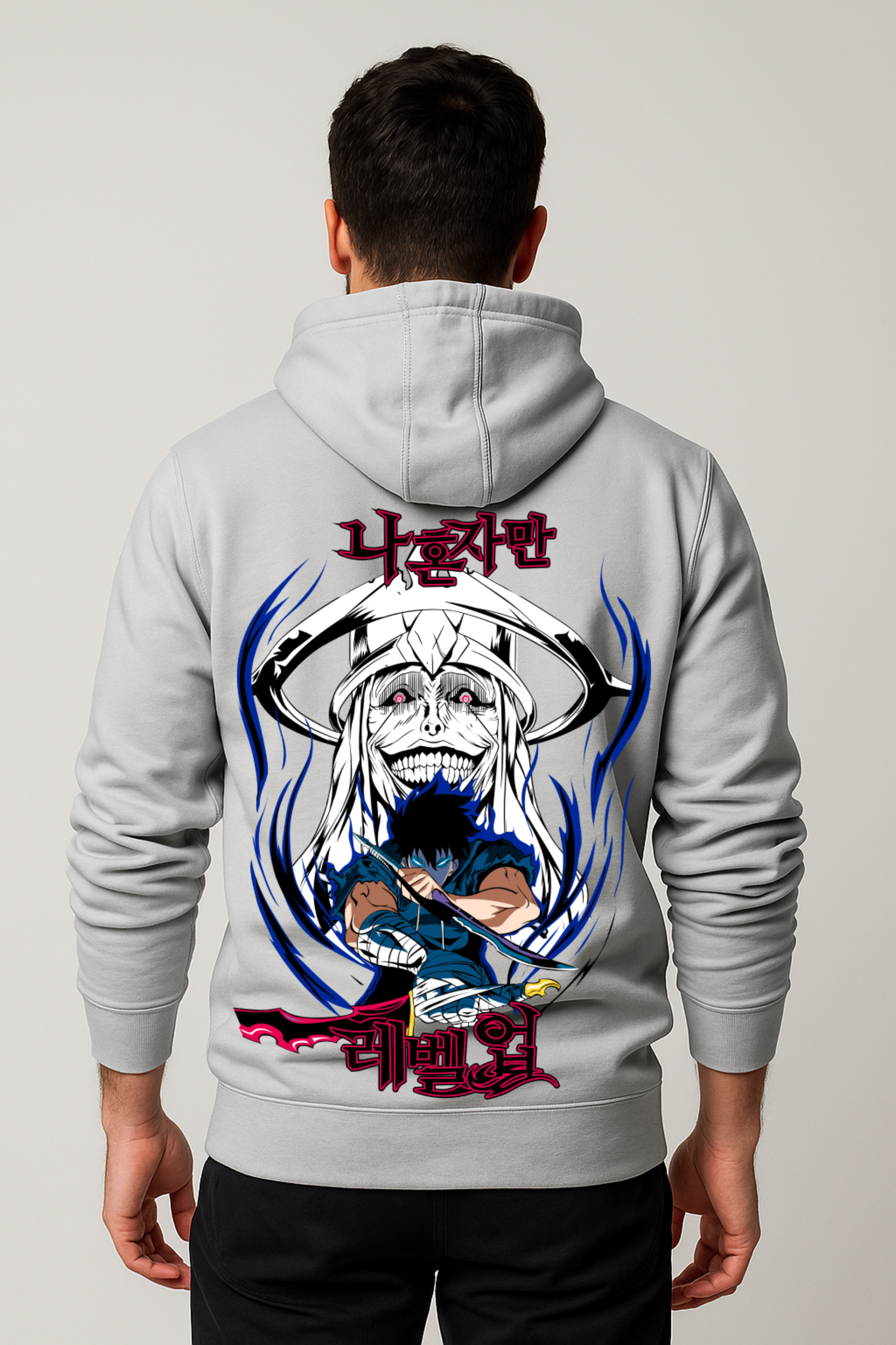The front is boldly stamped with "SOLO LEVELING" in sharp, electrifying text that screams power and mystery. Made from 320 GSM fabric (80% cotton, 20% polyester), this hoodie combines comfort with durability, making it perfect for your next raid or just a chill day in the city. Whether you're slaying monsters or showing off your fan loyalty, this hoodie is your perfect gear. Ready to level up your wardrobe? Grab yours now before it's too late!